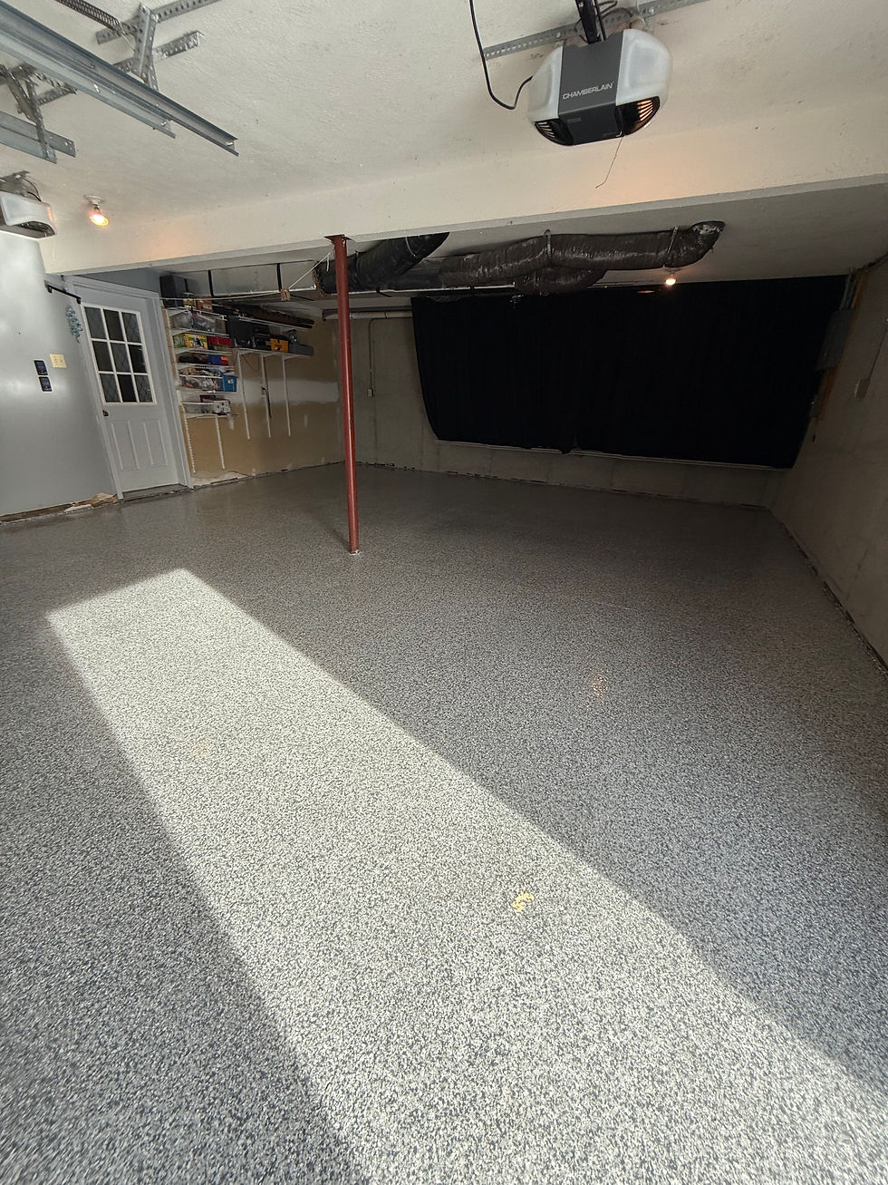 A well-installed epoxy or polyaspartic floor creates a strong, waterproof barrier that protects your garage floor from snowstorm damage. Here’s what it does: